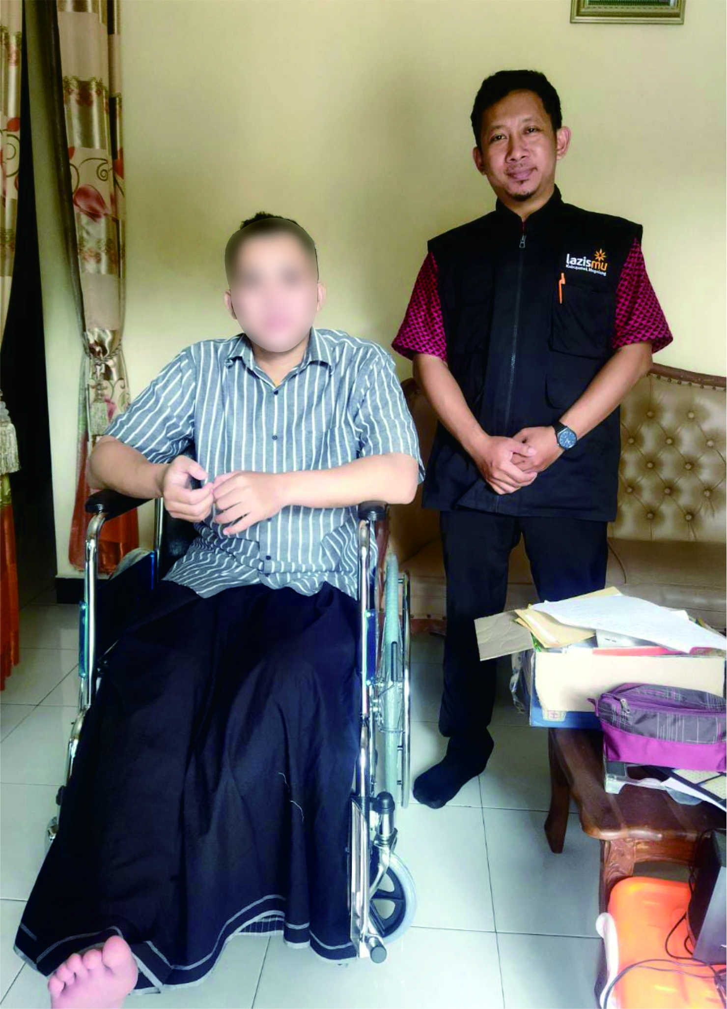 Selama proses penyembuhan beliau menggunakan tongkat penyangga sehingga kesulitan dalam kegiatan sehari-harinya, sehingga dari pihak Lazismu melalui program Peduli Guru memberikan Kursi Roda kepada beliau agar memudahkan dalam beraktifitas setiap harinya.